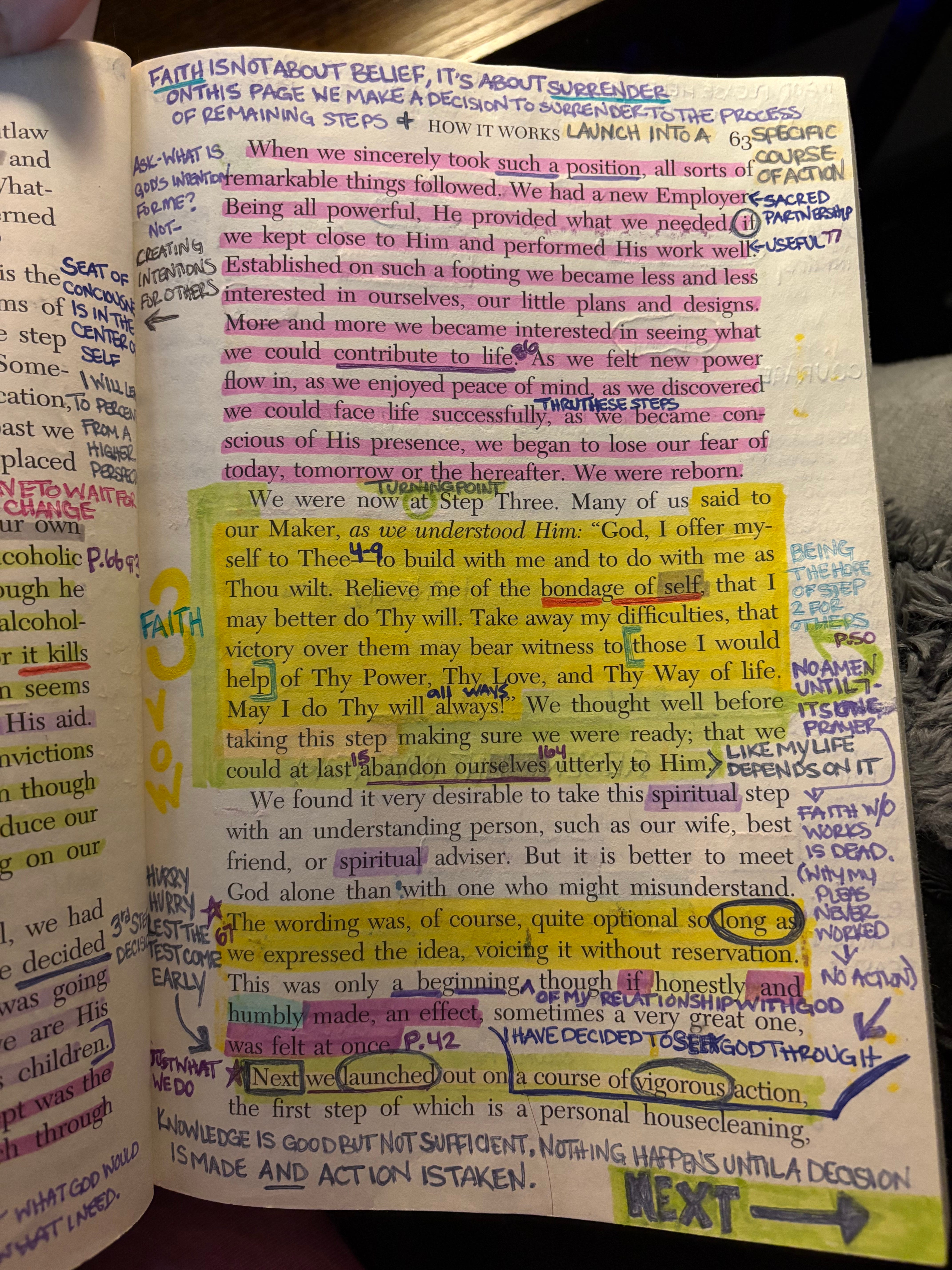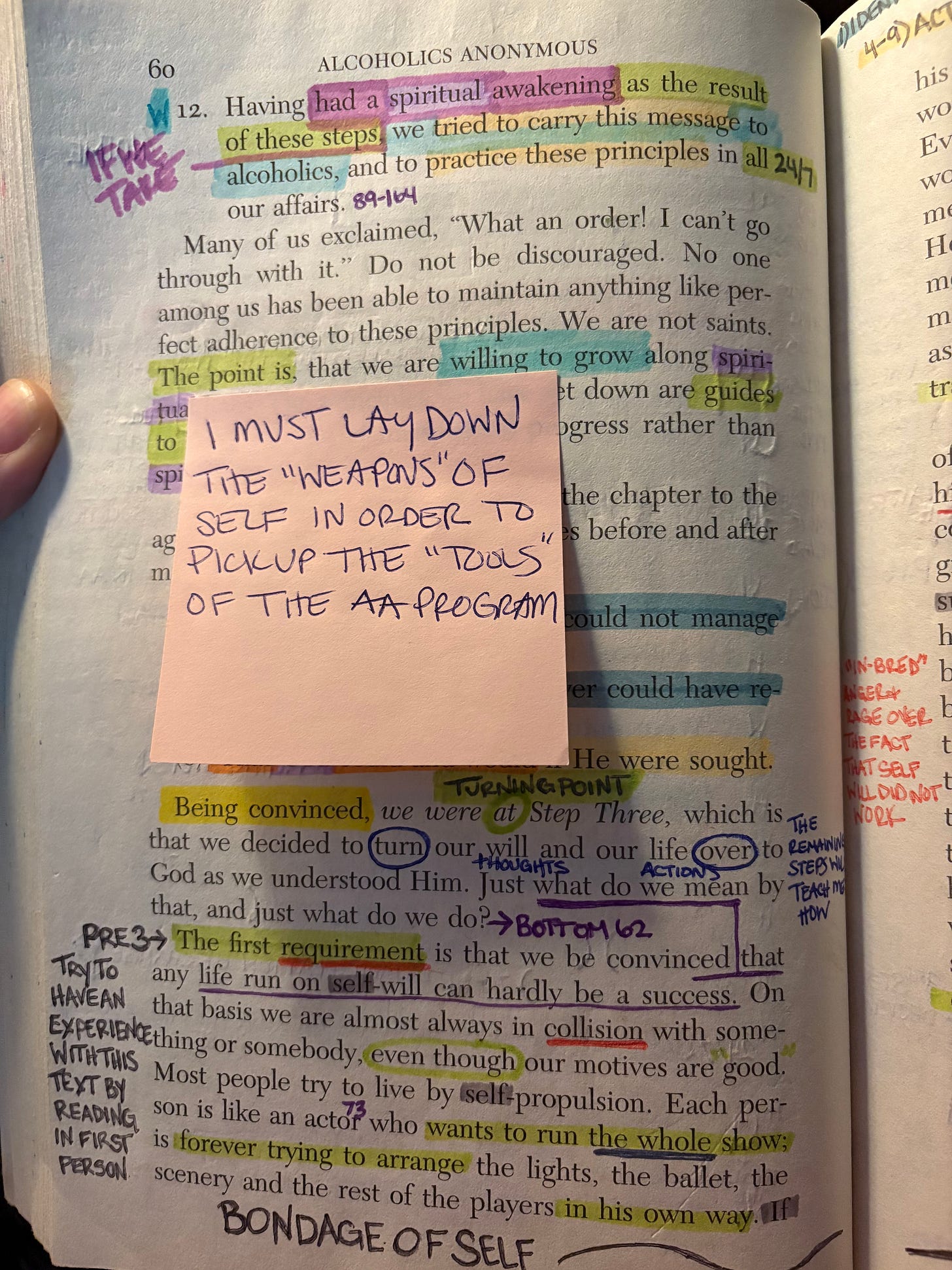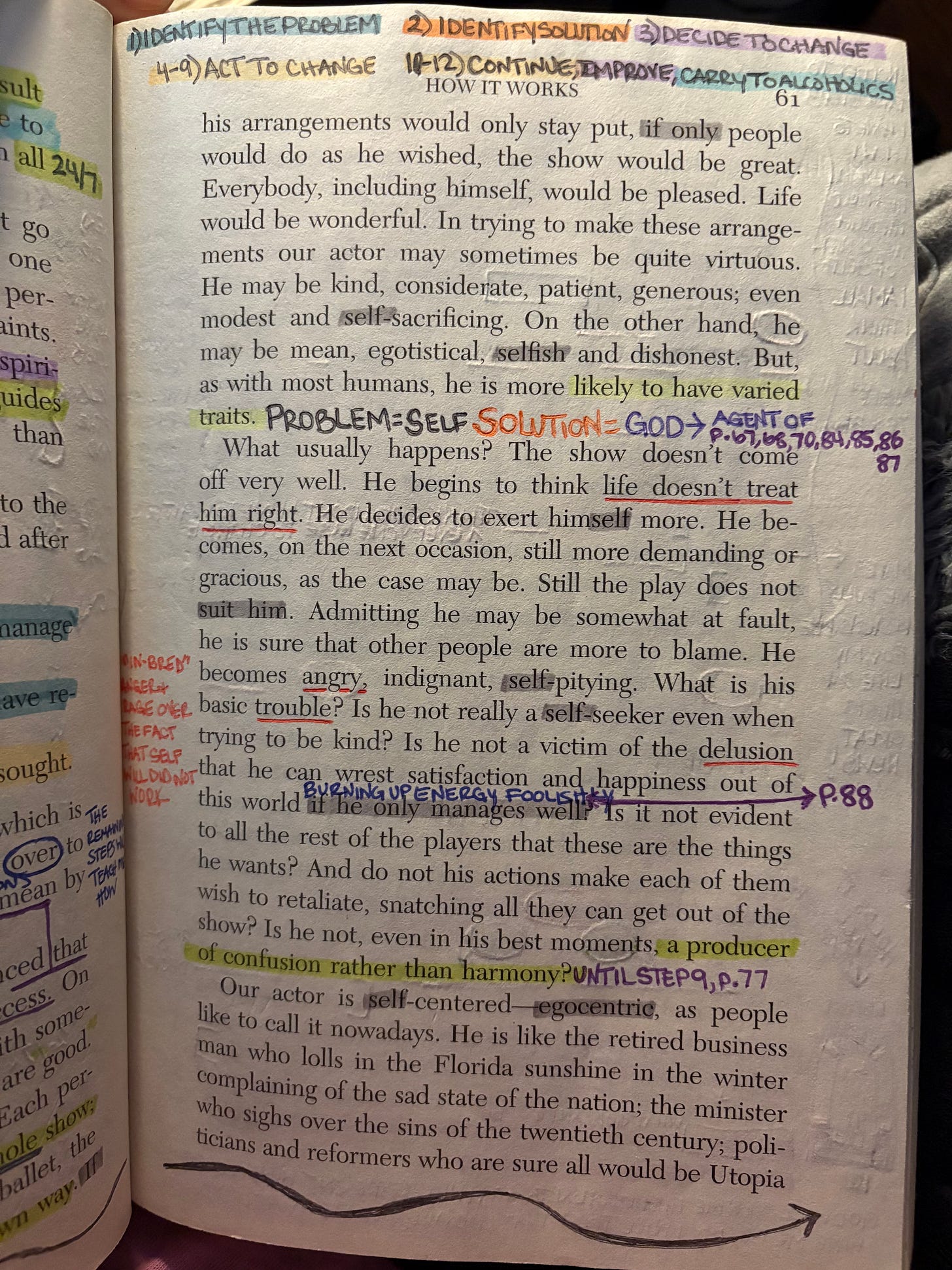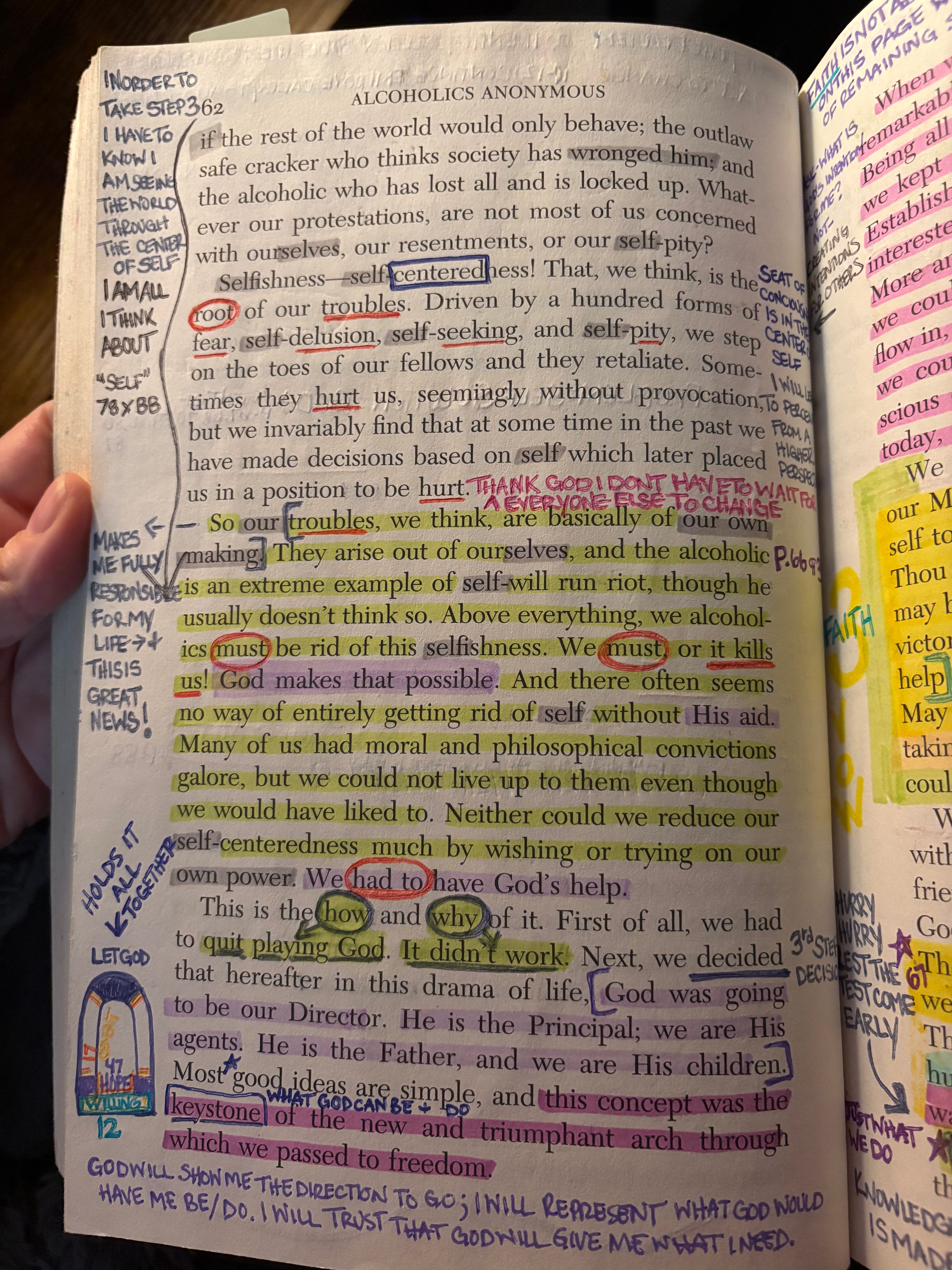 So my troubles, I think, are basically of my own making. They arise out of myself, and I am an extreme example of self will run riot, though I usually don’t think so. Above everything I must be rid of this selfishness. I must, or it kills me! God makes that possible. And there often seems no way of entirely getting rid of self without His aid. I have moral and philosophical convictions galore, but I cannot live up to them, even though I would like to. Neither can I reduce my self-centeredness much by wishing or trying on my own power, I have to have God’s help.